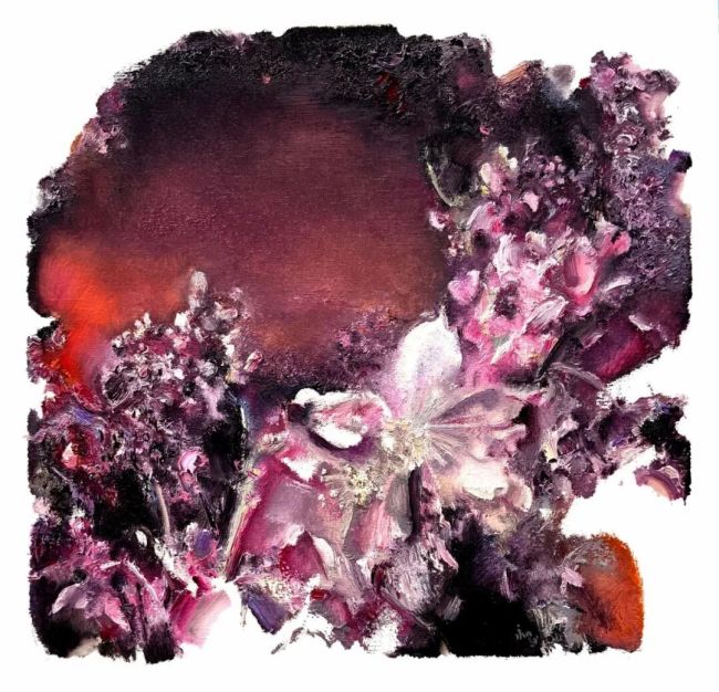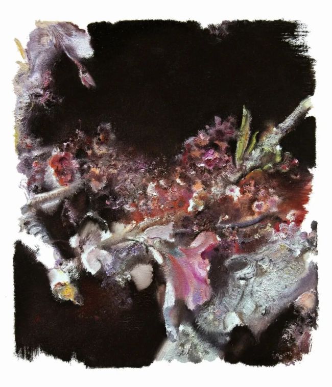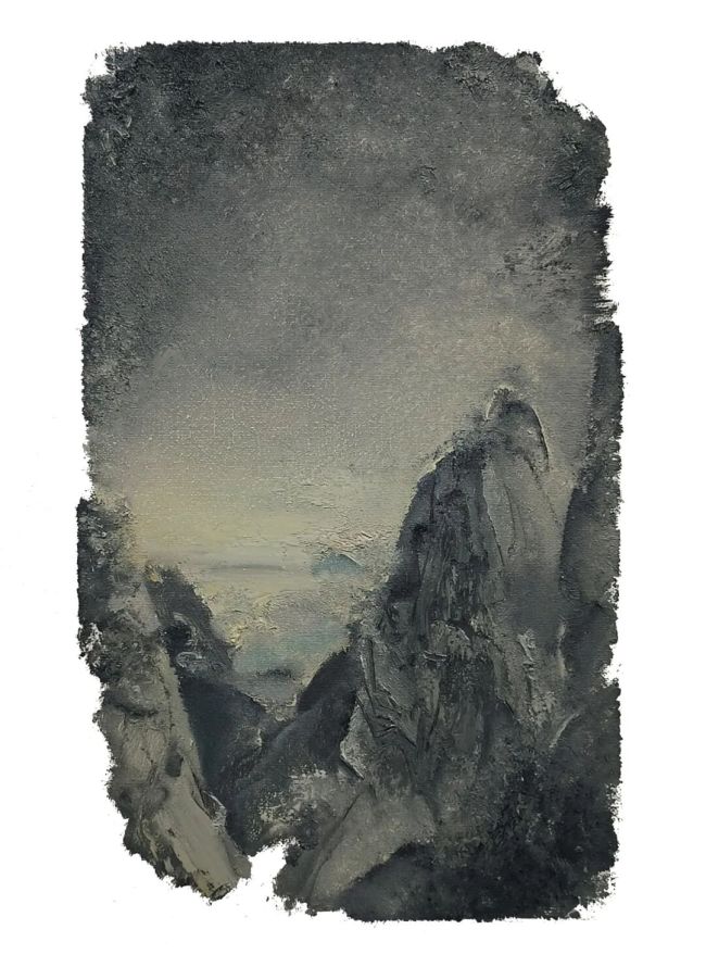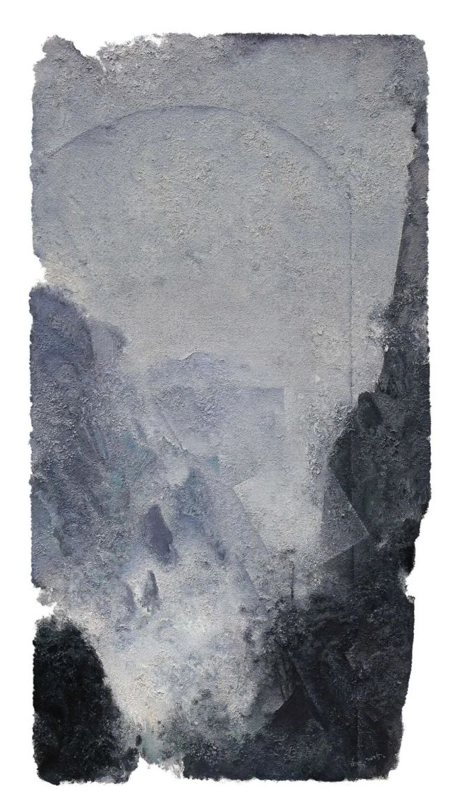 其表现手法兼具传统底蕴与当代视野,融合多种绘画技巧,将视野与学识融入创作之中。画面中常见的残片感、留白与未完成感,打破了传统绘画的完整叙事模式,更贴近人的观察与记忆本质——不是机械的取景裁剪,而是认知范围内的主动选择。这种独特的图式隐喻着个体存在的局限与对永恒的追寻,大量留白则如同对驳杂妄念的涤荡,让画面在简约中更显张力。颗粒状与絮状的笔触交织出丰富的肌理,既像是自然万物的细微回响,又暗合着思绪的多维流动。