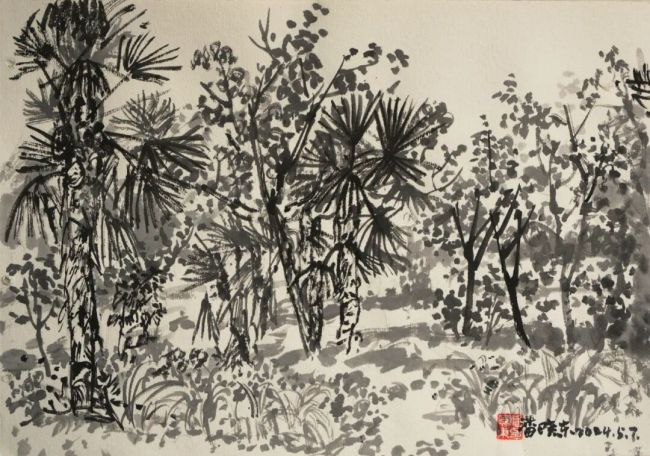 2024、5、13上午潘晓东《秦岭写生·林间阳光》2024年纸本水墨28cm×39cm