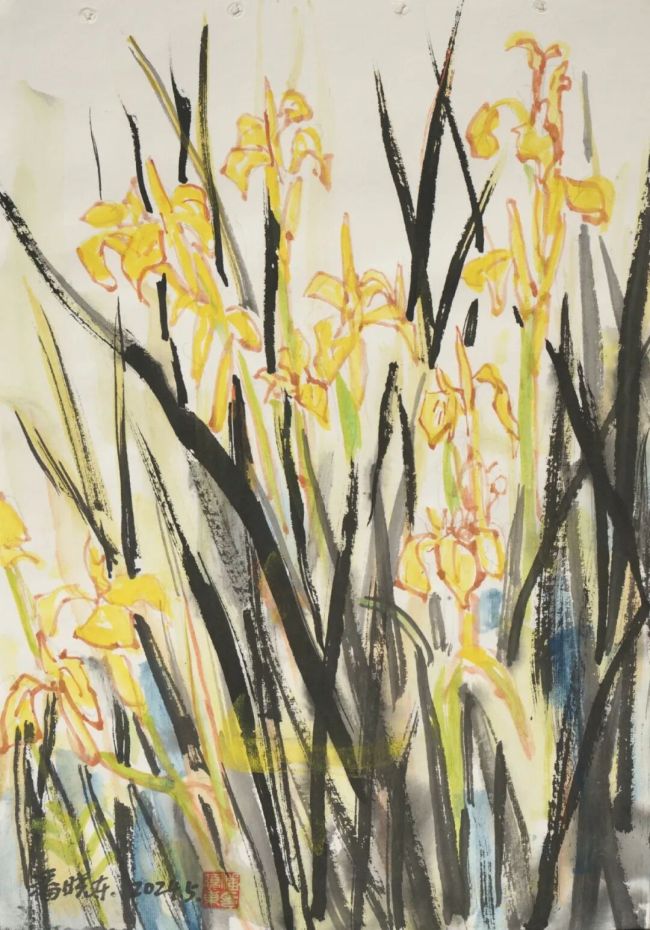 2024、5、10上午潘晓东《秦岭写生·黄菖蒲》纸本水墨39cm×28cm