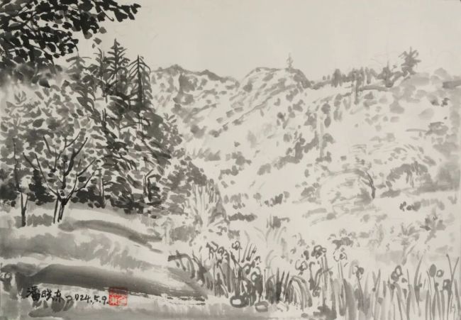 2024、5、7上午潘晓东《秦岭写生·林边》纸本水墨28cm×39cm