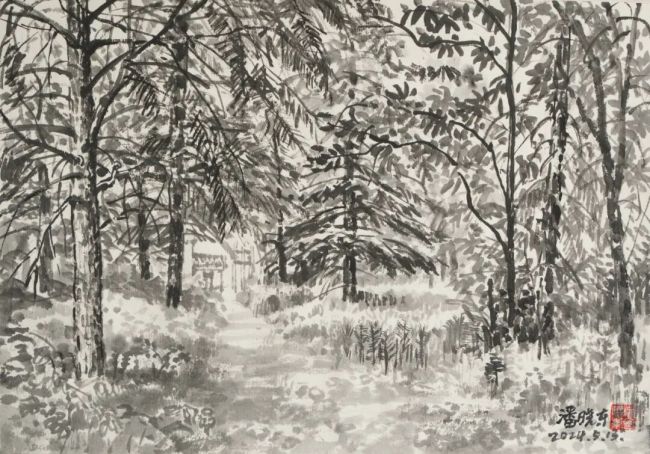 2024、5、13上午潘晓东《秦岭写生·林间阳光》纸本水墨28cm×39cm