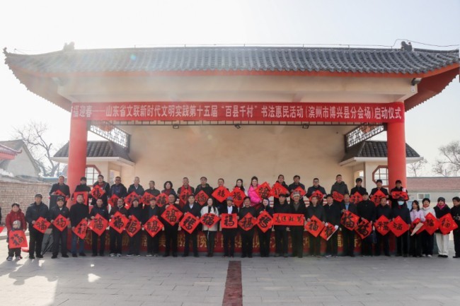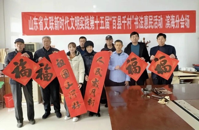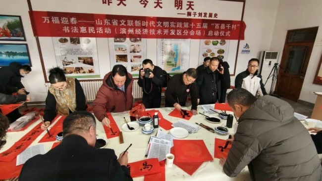 在滨州市沾化区东平村,滨州市文联党组成员、副主席王其槐,市文联副主席、市书协主席郭庆利,市书协名誉主席陈杰,市书协副主席兼秘书长杨健,市书协副主席刘海航,沾化区书协40位书法家和当地群众共300余人参加了分会场启动仪式。滨城区、邹平市、惠民县、阳信县、无棣县、博兴县、经济开发区、北海新区均同步开展活动,共有220余位书法家在2个小时内创作了5000余副春联,8000多个福字,300件书法作品,开展了9次书法大讲堂。