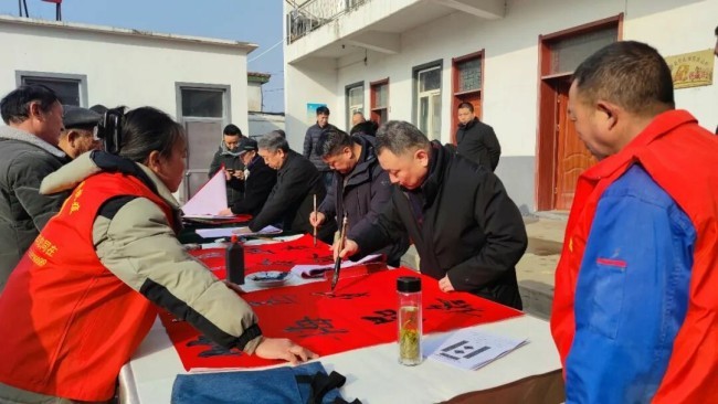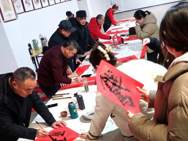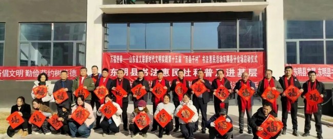在临沂市郯城县马头镇马东村,市文联党组成员、副主席于泳,省书协顾问姚东升,山东省书协副主席、市文联组联部主任张荣磊,市书协原副主席刘大海、杨少涛,市文联办公室主任、市书协主席徐志强,市书协副主席耿国生,市书协副主席兼秘书长张健,市书协副主席郭沂霞、孙艳梅,市书协主席团委员徐永、唐升霞、杨天鸣、孙合玉、焦念明,市书协副秘书长王洪川、李钢、卢克特、张雪莲、刘庆国、刘中昆,市书协办公室主任胡振久,书法家王德圣、刘中华、颜世君、林殿会、殷玉琴、王文卿、张娟、毕建宇、李洪玉,市摄协监事会主席韩成,郯城县政协主席聂文忠,郯城县委宣传部分管日常工作的副部长孙中民,马头镇党委书记周正薇,郯城县委宣传部副部长杨磊,郯城县文化和旅游局局长石瑞强,郯城县文联主席李建广,郯城县书协主席丁学宗,郯城县宣传文化系统业务骨干、县书协书法骨干、马东村村民代表等300余人参加了分会场启动仪式。活动现场,书法家饱含热情挥毫泼墨,为村民创作春联、福字及书法作品近3000件。书法家们在村委二楼举行了一场生动的书法公益大讲堂,与书法爱好者交流互动。