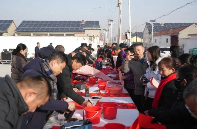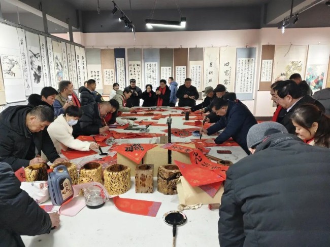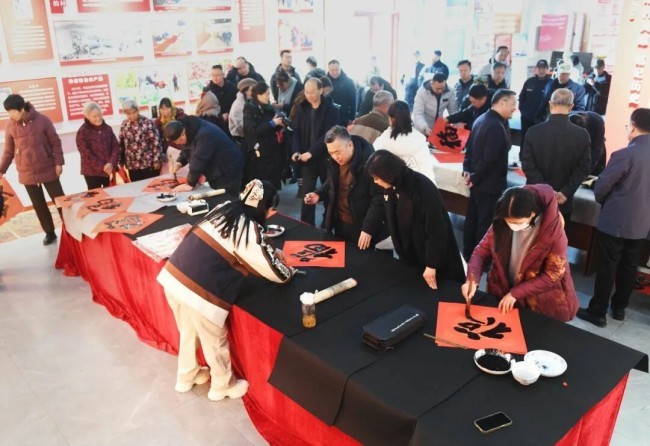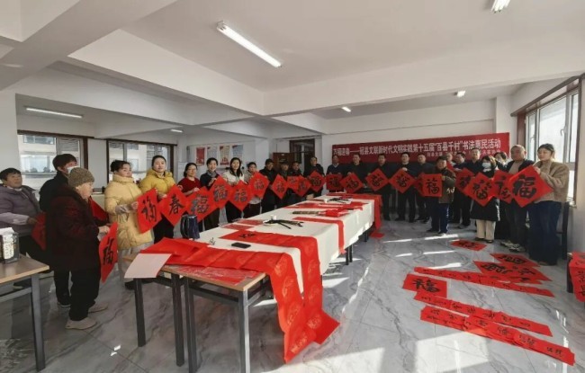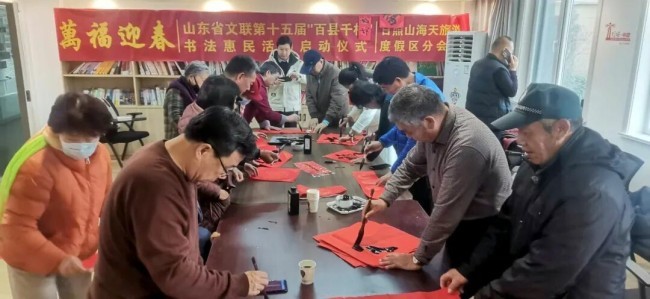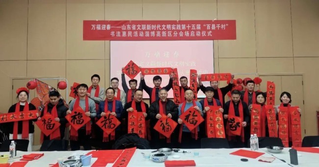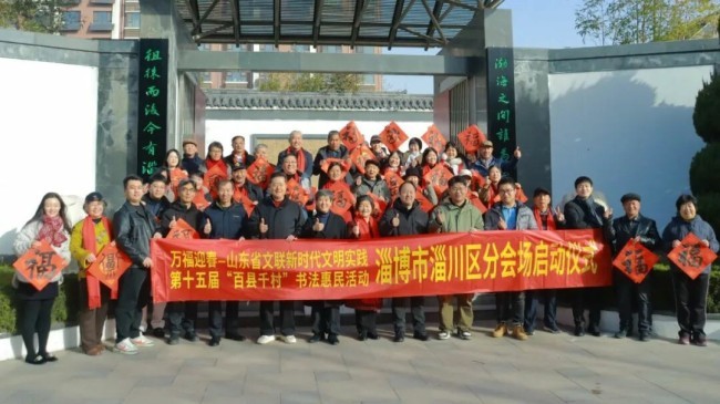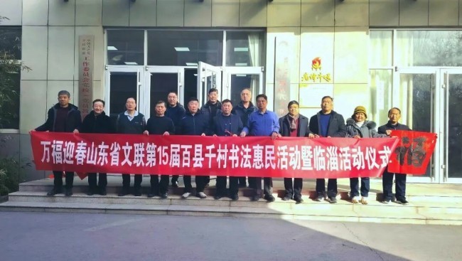 在淄博市张店区马尚街道钱家村,淄博市文联党组副书记、副主席吕德民,张店区委宣传部分管日常工作的副部长牟晓宇,淄博市文联副主席、市书协主席孙希民,张店区文联主席胡浩林,张店区马尚街道钱家村党支部书记彭军,淄博市书协副主席宋道永、巩绪发、王培伟、杨守华、刘正瑞、张伯祥、曹仕强、刘上林,淄博市青年书协副主席李小帅、陈炀、陈琪,淄博市书协高金成以及当地群众共200余人参加了分会场启动仪式。张店区、淄川区、博山区、周村区、临淄区、桓台县、高青县、沂源县、高新区均同步开展活动,共有100余位书法家在3个小时内创作了2000余副春联,5000多个福字,500余件书法作品。
