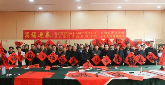在日照街道迎宾社区,日照市文联党组书记、主席韩通,市文联党组成员、副主席、二级调研员孟云,市文联党组成员、副主席骆道营,市文联副主席、市书协主席丁履磊,东港区区委常委、宣传部部长、统战部部长赵慧,东港区文联主席刘伟,东港区日照街道党工委副书记、办事处主任闫力,市书协副主席林玉柱、郑罡、赵波、高华松、刘玉明、魏会昌,市书协监事会副主席高霞、陈为森,市书协主席团委员李成峰、王波、张迪、李洪宜,市书协秘书长徐磊,市书协监事会秘书长陈德时,常务副秘书长徐立峰,副秘书长赵伟、当地书法骨干管朔、李晓红、于晓晴、庄春、李嘉博、沈名福、刘召海、王良允、宋洪茂、商庆国、丁海霞、尹茂聚、吴立彬、张守文、苗国祎、刘玉华、马德志,迎宾社区有关部门负责人及当地群众300余人参加了分会场启动仪式。东港区、岚山区、莒县、五莲县、经济技术开发区、山海天旅游度假区、高新区均同步启动活动,共有100多位书法家在3个小时内创作了2100余副春联,13500个福字。
