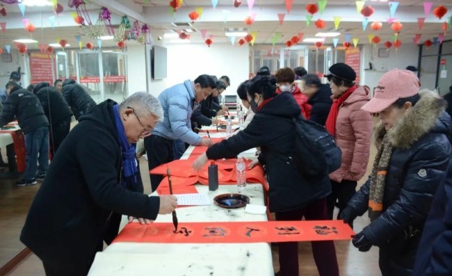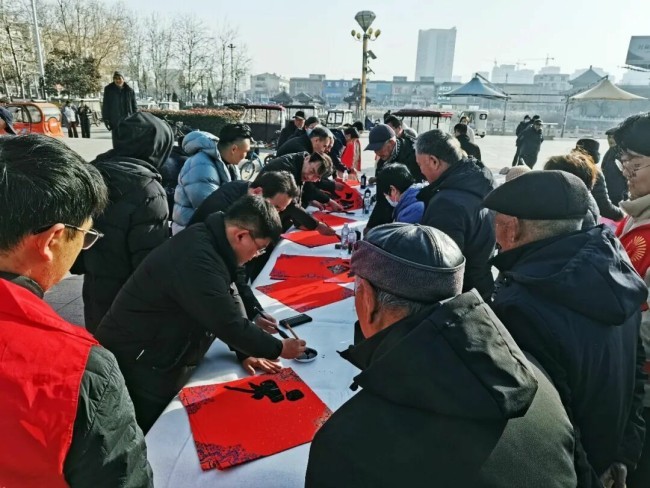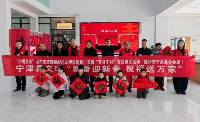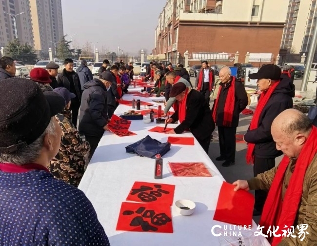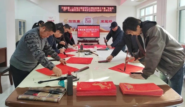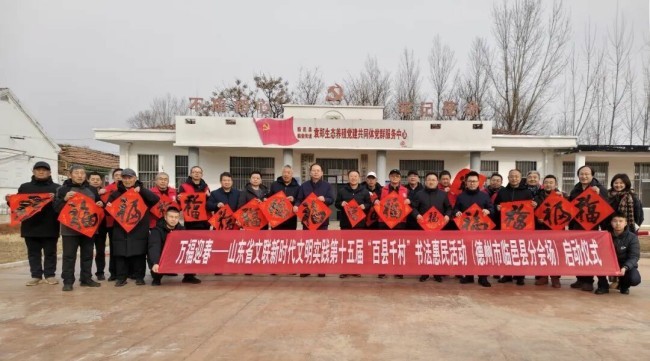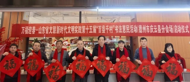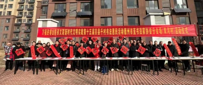 在德州市德城区广川街道办事处岔河社区,德州市委宣传部副部长、市文联党组书记李文豪,市文联党组成员、副主席盖其栋,德城区政协副主席、德城区文联主席周林静,德州市书协主席张春晓,德城区文联党组书记曹东昱,德城区广川街道党工委书记、一级主任科员王新,德城区广川街道党工委委员宋文慧,德州市书协李寿山、陈彦豪、闫长军、王志、肖龙、仝传刚、周德立、杨宝波、李云霞、宋红心、王连和、周继东等书法家以及当地群众共500余人参加了分会场启动仪式。市直书协、德城区、陵城区、禹城市、乐陵市、宁津县、临邑县、平原县、武城县、夏津县、庆云县均同步开展活动,共有300余位书法家在3个小时内创作了7200余副春联,12000多个福字,430余件书法作品,开展了13次书法大讲堂。
