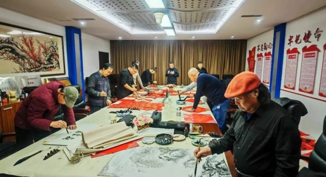在齐鲁石化公司职工艺术馆,公司工会、文联、群众工作部有关领导和齐鲁石化美术书协骨干作者赵锐、聂晓军、陈本勇、孟庆宾、王纪刚、王嘉新、张正人、刘冰、曹仁杰、郇庆民、赵新华、刘志远、许卫东、宋焘、周兴盛、朱慧玲、杜彩霞以及职工代表30余人参加了分会场启动仪式。新、老两个生产厂区同步开展活动,共有15位书法家在3个小时内创作了400余副春联,500余个福字,40件书法作品,活动烘托出浓浓的节日氛围,为企业安全生产、扭亏创效注入了满满的文化正能量。