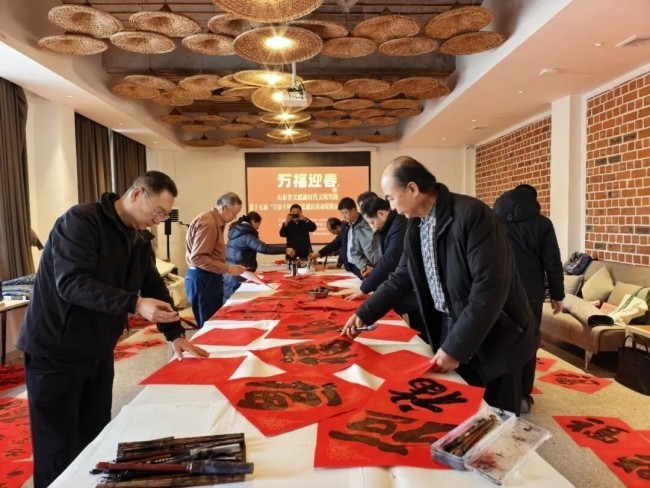 在山东工艺美术学院文化创意产业园会议室,山工艺资产管理处处长张振羽,财务处处长滕丕强,后勤管理处处长杨亚波,后勤管理处副处长孙春波,资产管理处副处长、文化创意产业园办公室主任尹怡朋,建筑与景观设计学院院长李文华,党总支书记姬升果、副院长胡英盛,党总支副书记姜华,资产处房产科科长韩英杰,山东省教育书协副秘书长刘金锋、翟圣亮、潘锐、梁成立,济南大学教授王书峰,山东工艺美院教授陈锋、徐学炳、朱员,山东工艺美院后勤员工等30余人参加分会场启动仪式。现场,八位书法家在3个小时内共创作了200余副春联,500多个福字,60余件书法作品。围观教师热情洋溢,高兴不已,红红的春联和福字透着浓浓的年味。教育书协将以此活动为起点,继续组织文艺志愿者把新春祝福送入百姓家。