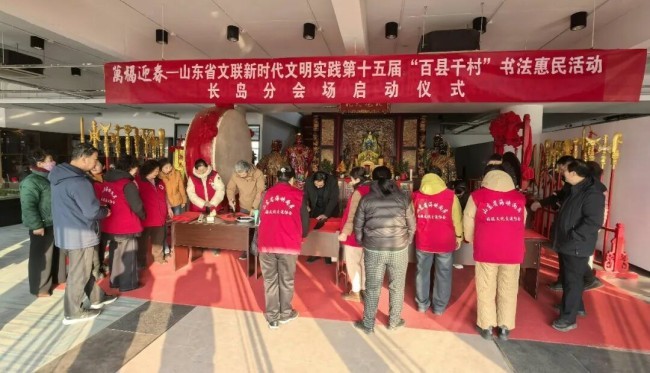 在烟台龙口市七甲镇常伦庄村,山东省书协副主席、烟台市书协名誉主席嵇小军,烟台市文联党组书记李波,烟台市文联党组成员、副主席张绍文,烟台市文联组联部主任曲永静,烟台市书协主席姜玉松,中共龙口市委常委、宣传部部长夏俊庆,龙口市文联主席王运光,七甲镇党委书记闫彪,龙口市革命老区建设促进会副会长、常伦庄村党支部书记王忠金,烟台市书协宫庆全、孙秀杰、徐喜丹、陈希军、王宁波、庄严、王利亮、高兴志、曹成智、栾少东、姜云军、戴慧媛、赵尧龙、包颖华、迟伟、陈炳运等书法家和当地群众共230余人参加了分会场启动仪式。芝罘区、莱山区、高新区、福山区、黄渤海新区、莱阳市、莱州市、蓬莱区、海阳市、栖霞市、牟平区、招远市、长岛综合试验区也同步开展活动,共有200余位书法家在3个多小时的时间里创作了春联3800余副,福字6000多个,书法作品430余件,举行书法大讲堂4场。