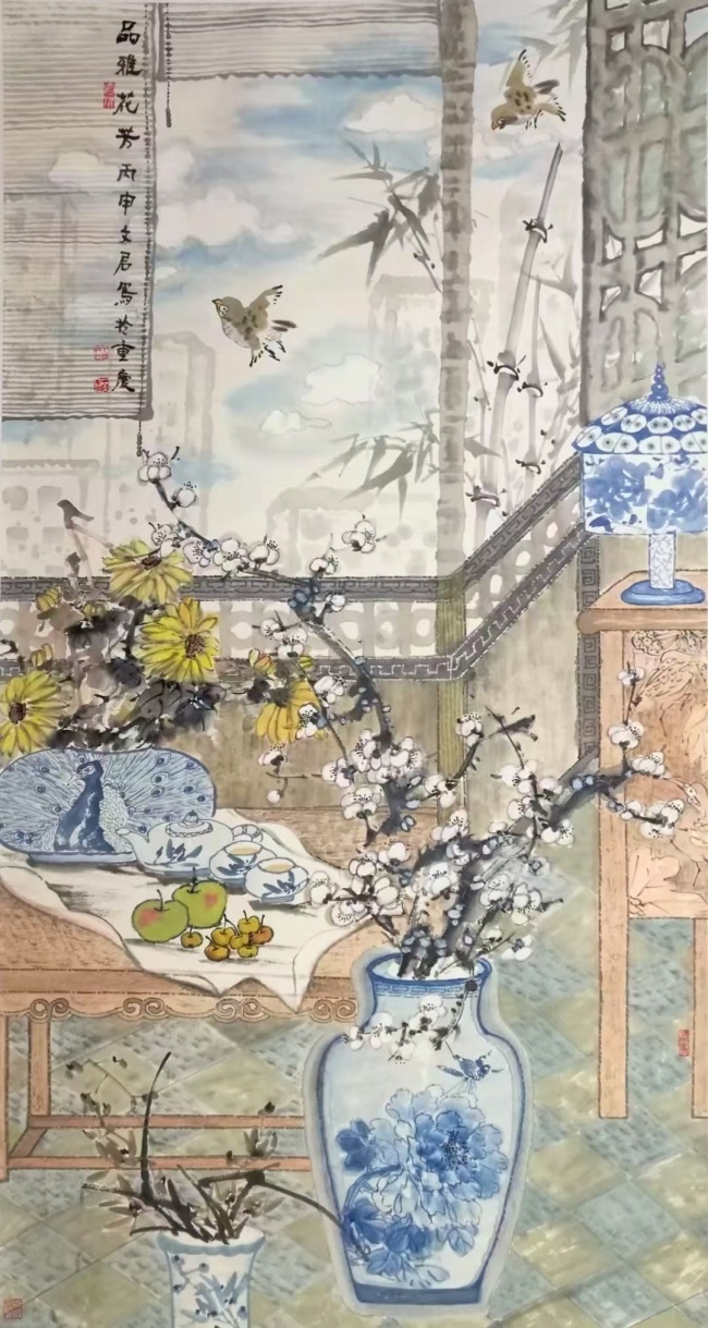 石文君,女,中国美术家协会会员、中国国画家协会理事、重庆市女书画家协会副会长、重庆梦斋艺术中心副院长。跟随彭志灵、彭柯先生习画几十年,八十年代画风学习著名画家郭怡琮、苏葆祯先生。作品喜其色墨互融,崇尚石涛、八大、白石诸家。主张注重传统、另立新意。