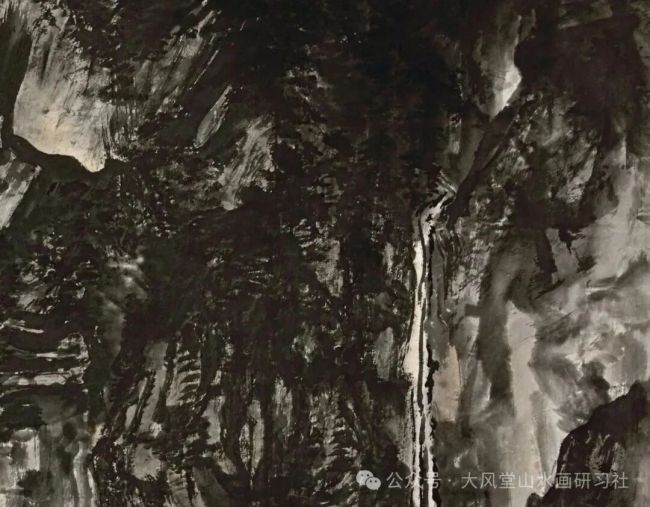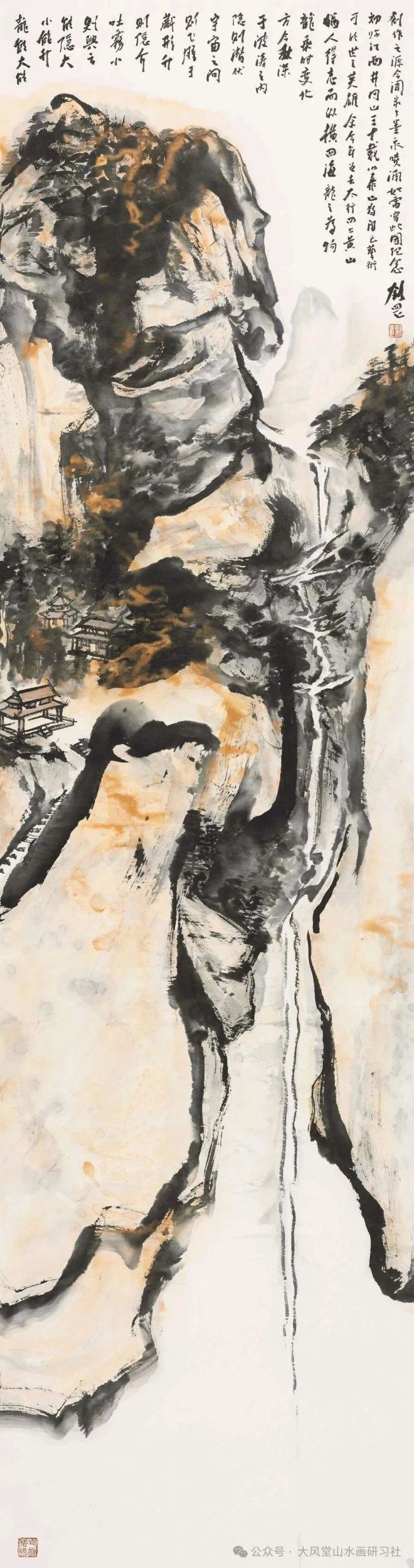 这份宏大气象的背后,藏着刘罡对笔墨节奏的精妙把控,使作品在雄浑壮阔中不失雅致法度,于豪放挥洒中自有内敛节制。《中庸》所言“发而皆中节,谓之和”,恰是这份节奏之美的核心要义——情感的抒发需有尺度,笔墨的铺陈当有章法,正如孙过庭所强调的“不激不厉,而风规自远”,艺术的豪放从来不是无拘无束的放纵,而是筑基于严谨法度之上的从容挥洒。刘罡的山水,本质上归于豪放一路,却始终以理性驾驭情绪,在笔墨的轻重缓急、虚实收放间,勾勒出鲜明的节奏韵律。画面之中,既有吞吐大荒、天风海雨的大开大合,亦有笔墨精微、意趣绵长的细腻铺陈;既有气吞山河的雄浑之势,亦有含蓄蕴藉的留白之美。他避开了一味放纵导致的荒率江湖气,也挣脱了拘泥法度带来的刻板匠气,让理性与情感在笔墨间达成微妙平衡,使每一笔、每一划都“中节”合度,最终成就了作品“致广大而尽精微”的审美品格,让观者在领略雄浑气象的同时,亦能品味到笔墨流转间的韵律之妙。