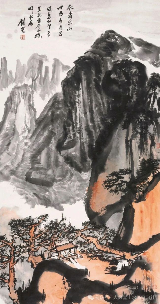 刘罡山水最动人心魄者,莫过于那横贯画面的宏大高远之气。这份气象,植根于他对泰山风骨的深切体悟,亦源自对海岱文化的沉潜浸润。泰山作为五岳之尊,雄峙东天,其磅礴之势与厚重底蕴,向来是山水画中最难企及的精神内核——绘其形易,传其神难,融其文化肌理于笔墨更难。刘罡与泰山,从最初对物象形态的追摹,逐步走入物我两忘、心手相契的境界,笔下山水早已超越了简单的实景复刻,达到了“浑不知我为泰山欤,泰山为我欤”的通透之境。他笔下的山川,既有峻极于天的雄伟挺拔,亦有曲径通幽的幽深静谧;既有层峦叠嶂的厚重沉郁,亦有云岚流转的灵动变幻。那份纵横吞吐的苍茫之气,那份浸润了千年文脉的海岱气象,并非刻意雕琢所能得,而是画者将自身情志与山川精神深度交融的自然流露,是摒弃了斤斤于形似的浮躁、褪去了汲汲于物欲的功利后,方能抵达的艺术彼岸,非庸常之辈可窥其门径。