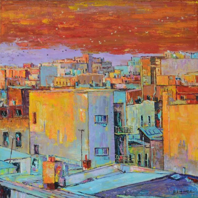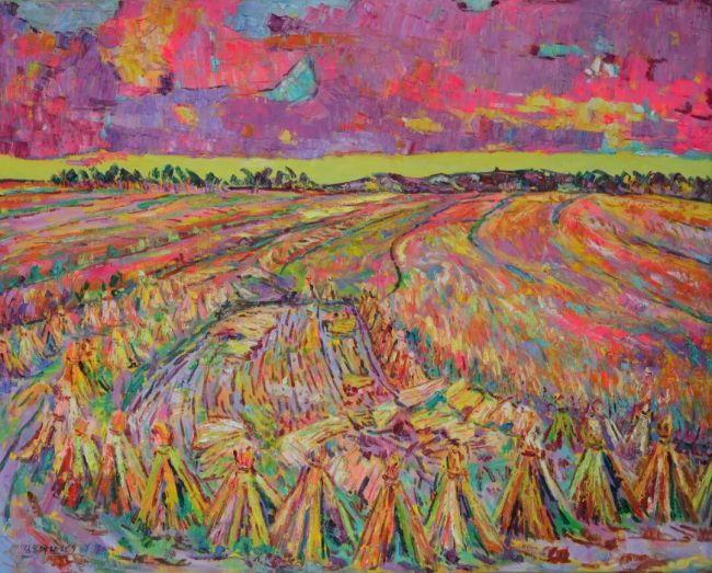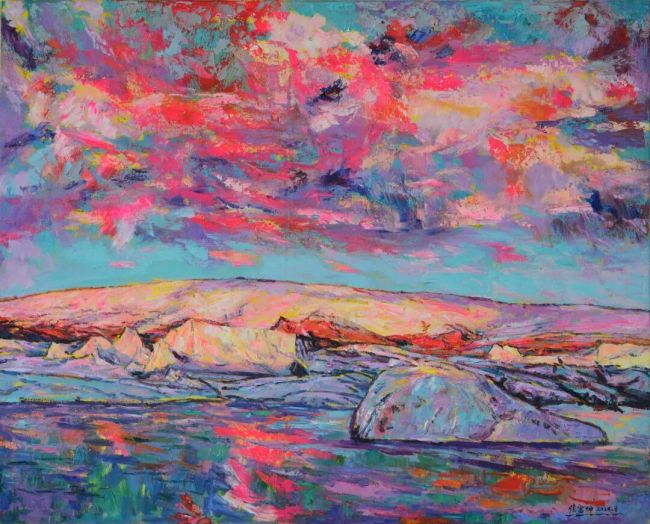 张富坤的油画世界,如大自然之魂魄在画布上纵情奔涌。他笔下的晚霞,每一道光芒皆被赋予了生命的炽热,朱砂与青莲在画布上角力、融合,像天穹之中正进行一场壮丽而无声的争斗。而那海边晚照下归帆,却被晚霞温情地拥抱于怀中。船帆被映照得如同燃烧的火焰,又似被霞光温柔浸透的纸片,漂浮在波光粼粼的海面之上。这些帆影被霞光染透,恰如漂泊者最终接纳了自然慷慨的馈赠,成为人间烟火与天地壮阔之间,一座深情而温暖的桥梁。