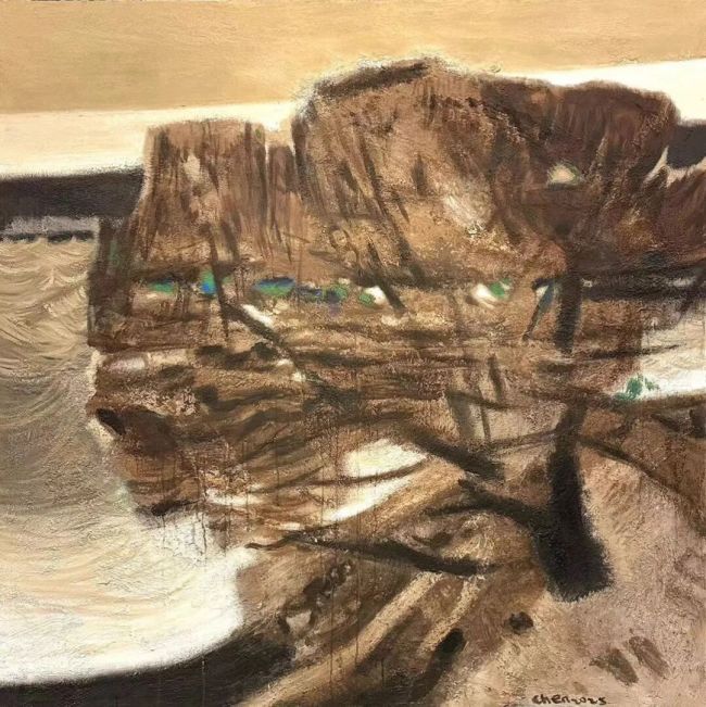 黄河主题的系列创作则构建起另一条精神脉络。作为生长在渭河发源地的本土艺术家,陈卫国对黄河有着特殊情感,其作品中始终贯穿着对母亲河的文化解读。《黄河古柳》刊登于2023年《中国油画》,画面以扭曲的枝干与厚重色彩表现古柳的苍劲,那些交织的笔触既是树木的生长轨迹,也是黄河文明的精神象征。近期综合材料作品《天下黄河之三》发表于2025年《中国油画》,他将黄河泥沙、沿岸陶片与颜料融合,通过大面积色块铺陈与局部细节刻画的对比,展现黄河从源头到中游的地貌变迁,画面中流动的肌理仿佛黄河奔涌的生命力,实现了对黄河文化的当代诠释。