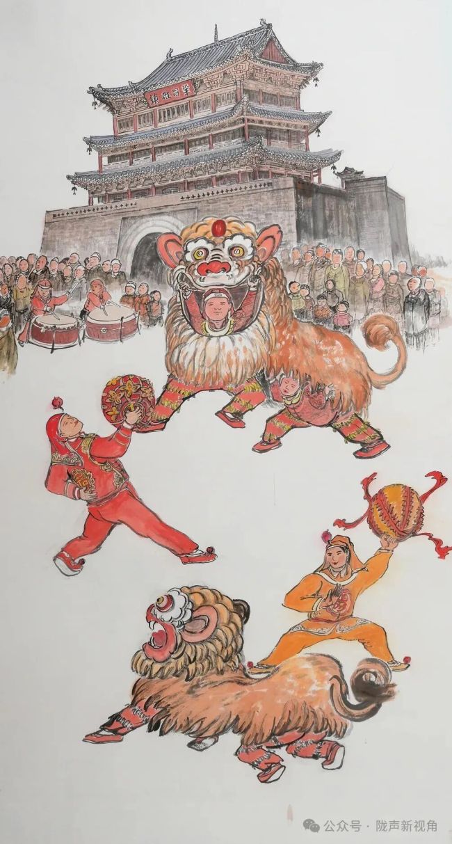 当笔毫饱蘸浓墨触碰到宣纸的那一刻,陇西古城的春节烟火便顺着笔锋流淌开来;当画卷上的舞龙狮头扬起、社火锣鼓敲响,沉睡在黄土高原深处的民俗记忆,便在笔墨间苏醒。中国美术家协会会员、二级美术师、陇西县美协主席、陇西书画院专职画家梁宗文,以十三幅陇西迎春民俗非遗文化美术作品,为这座古丝绸之路重镇的春节民俗立像。生于陇西、长于陇西的梁宗文,出生于大户人家,家学渊源崇文重艺。表兄长梁宗孟亦是中国美协会员,著名现代主义表现油画家、雕塑家;毕业于西北师范大学美术学院的儿子梁大烔也是非常优秀的专业画家,擅长写实人物画,作品已入选过全国性美展。梁宗文深耕本土文化土壤数十载,师从何水法、陈钰铭等书画名家,在花鸟山水领域斩获颇丰——作品多次入选全国性美术大展,被故宫博物院、中国艺术研究院等权威机构收藏,艺术事迹和作品更登载于《人民日报》《光明日报》《中国美术报》《中国文艺》等主流报刊媒体。此番创作,他褪去象牙塔的艺术滤镜,秉持“艺术回归人民”的初心,让氤氲着烟火气与生活味的民俗图景,在宣纸之上焕发出历久弥新的光彩,也让陇西这座古城的“春喧”盛景,在笔墨中成为永恒的美好。