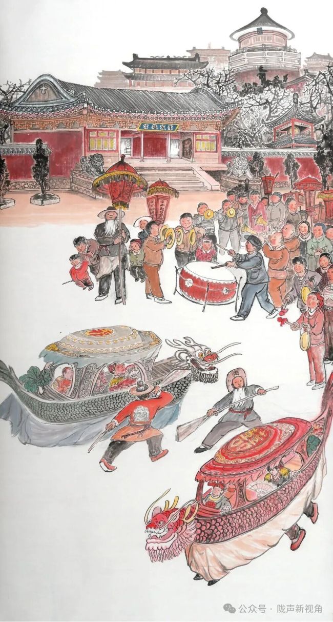 在《古郡雄风闹春潮》中,梁宗文将陇西威远楼作为画面的背景主体。这座始建于北宋的钟楼,历经千年风雨仍巍然屹立,楼体的斗拱、雕花、匾额,皆以工笔细描的手法精准还原,甚至连楼檐下的铜铃、墙面的斑驳痕迹都刻画得入木三分。画面前景,舞狮队伍正从威远楼下穿过,红绸翻飞、狮头腾跃,历史建筑的沉稳与民俗活动的灵动形成鲜明对比,仿佛千年前的古城喧嚣与当下的春节热闹在此刻交汇。而在《龙游苍海尽归巢》里,他将视线投向陇西的李家龙宫,这座为纪念李氏先祖而建的祠庙,飞檐斗拱间透着庄严与厚重,画中舞龙队伍绕着龙宫的照壁盘旋,龙身的鳞甲在笔墨的晕染下熠熠生辉,既展现了陇西作为“李氏故里”的历史底蕴,也让龙文化这一中华传统符号,与当地的宗族文化、民俗信仰深度融合。