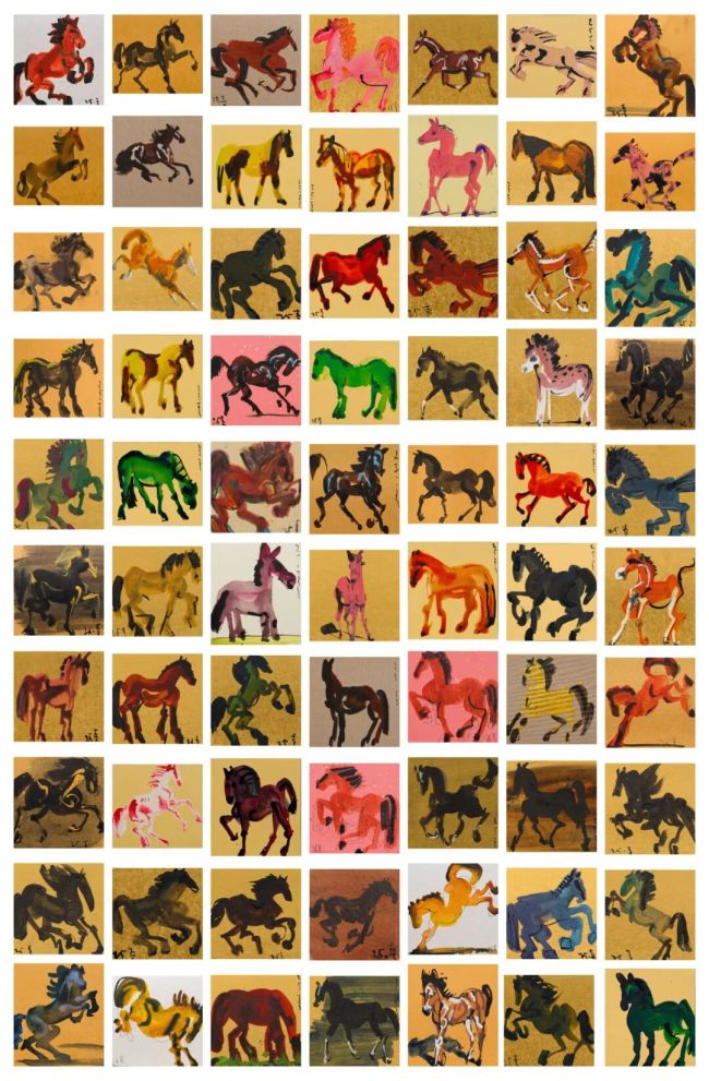 往岁新年,常青亦画新岁属相。逢马年,祥瑞临近,常青不仅动手早,而且他的马,骏态特出,风姿洒然,颇具一副神气。这种马四蹄连环,很有连环马的意思。我感觉:今年他的马会出奔马图、一百零八马图,预示马年的丰盛瑞象。