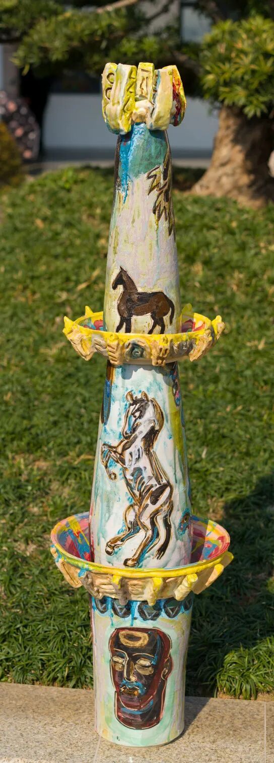 这次展览的立体部分我邀请了阿郎前来助阵,这两年他一直在做陶,这是我们父子的首次同台,感谢许院长给画展取名“马驹同行”,并写短文鼓励我们。阿郎很有才华,私底下我叫他“偶像”,他的确是我的偶像,他很小的时候就画得跟毕加索一样好了,他那些小时候的杰作至今仍挂在我工作室的墙壁上,也被收录在早些年我们父子三人的一本合集《三原色》之中。