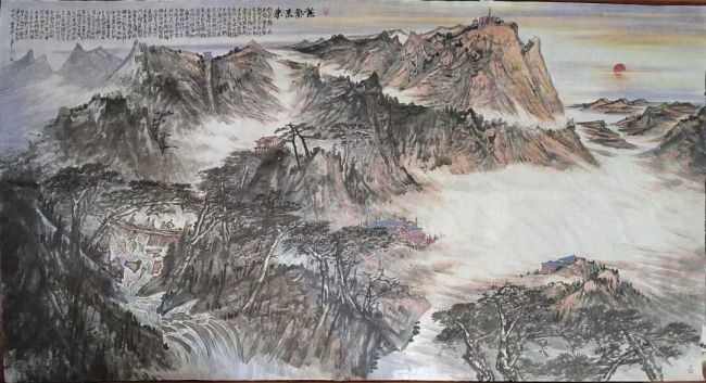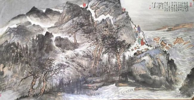 作为土生土长的山东画家,他的创作始终饱含对家乡山河的深情。泰山的厚重、黄河的奔腾、泉城的灵秀,都成为他反复描摹的对象。他笔下的山峰,多以硬朗的线条和皴擦表现齐鲁大地的雄浑风骨;而云雾与流泉的处理,又透着江南山水的温润灵秀。这种刚柔并济的表达,恰是他性格与地域文化的双重映射。他画中的人物,或立于山巅远眺,或临溪而坐,往往只以数笔点染,却与山水融为一体,传递出“天人合一”的传统哲思。