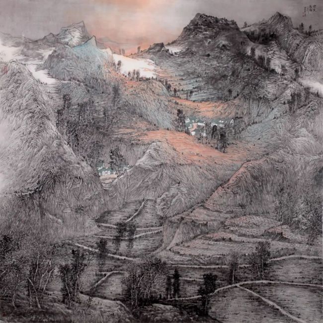 在当代语境下,田在武并未固守传统,而是在笔墨语言中不断探索突破。他的作品既有对“全景式山水”的传承,也融入了现代构成的视觉张力。大幅作品中,他以开阔的视野铺陈山河万里,细节处却见精妙的笔墨推敲;小幅册页则更显空灵雅致,寥寥数笔便得丘壑之美。这种“大处着眼,小处着手”的创作理念,让他的山水既有史诗般的宏大气象,又不失文人画的书卷气息。