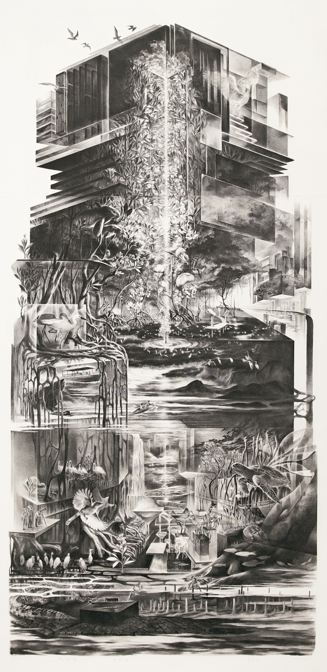 在展览中,我们看到版画家们将创作的视角延伸到祖国建设、人民生活的方方面面,以他们特有的艺术方式去讴歌时代、讴歌人民。参展作品既有宏观视角的叙述表现,也有从日常生活中的细微观察出发,从小角度融入大内涵的创作切入点。王戈《城市风光——共享生态家园》、时素梅《农耕记事》等作品聚焦社会变迁,描绘中国城乡在环境、生产生活方面日新月异的景象,且通过灵活的画面构图或组合,呈现出别样的版画叙事方式。叶文熙《新家园》以大尺幅石版拼版而成,运用石版画特有的颗粒感肌理,细腻丰富地描绘了人与自然和谐共处的美好景象,试图引发观众对生态保护理念的关注和共鸣。游宇《国家记忆·电话》以独特的构思描绘了具有年代感的电话物件,串联起人们对国家发展建设历程和过往生活的记忆,使传统水印木刻赋予了新的活力。陶加祥《问鼎苍穹》、王水山《问海》通过对“国之重器”的描绘,表达了作者对国家科技实力不断提升的赞美与自豪之情,同时,分别发挥了综合版的凹凸印痕特性和木刻油印丰富厚重的特点。宋阳《青峦筑梦·第一乐章》从历史文化中汲取灵感,通过对传统文化元素的挖掘和再创作,展现民族的精神内涵和文化底蕴。画面融合了传统版画技法与当代审美趣味,体现了作者对当代文化与传统文明交融、叠加的思考。李长兴《多彩新篇》、杨媛媛《已然远去的风景》等作品通过人物、动物与场景的有机组合,不仅营造了超然且具有意境的画面氛围,也由此隐喻作者对现实的思考和精神自由的追求,并分别展现了石版画水墨套色和铜版画蚀刻的高超技法。郑建辉《共舞的世界》、刘晓军《时光》、刘夕琳《清风徐来》等作品通过别样的视角展现了日常生活中美好、宁静、温馨的诗意化场景,将自己对生活的热爱及美好事物的向往融入画面。还有一些作品关注个体的情感体验和内心世界。比如,段凯《那些孤独的年轻人》通过精到的铜版画腐蚀技法,传达出迷茫、喜悦、孤独等情感,让观众感受到艺术家内心的世界,也引发自身对生活和情感的思考。