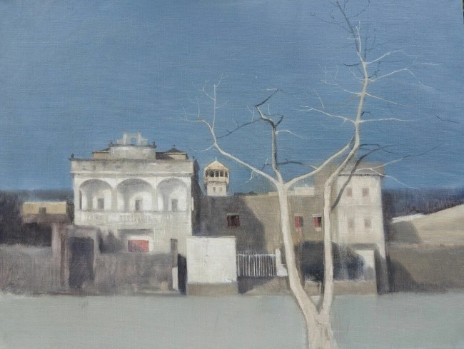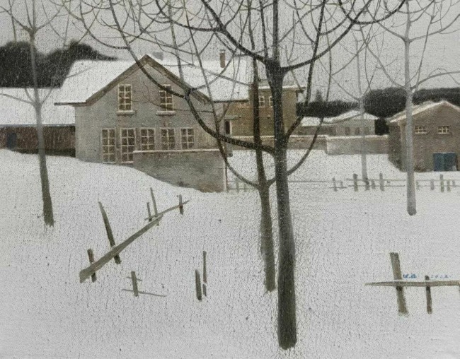 空间的营造,是沈磊油画中另一重耐人寻味的表达。他笔下的屋舍从不孤立存在,而是与枯木、雪野、矮墙形成默契的呼应。前景的雪野常以大面积的留白铺展,中景的屋舍错落排布,背景的林木则在朦胧的灰雾中渐次隐去,这种由近及远的层次处理,不仅让画面拥有了通透感,更暗含着关于“距离”的思考。观者仿佛站在雪地里回望故乡,眼前是清晰可触的温暖,心底却又藏着无法言说的疏离。这份空间的张力,让静态的画面生出动态的情绪流转,我们在凝视屋舍的同时,也在被屋舍凝视,在这片荒寒的景致里,完成一场自我与过往、当下与远方的精神对话。