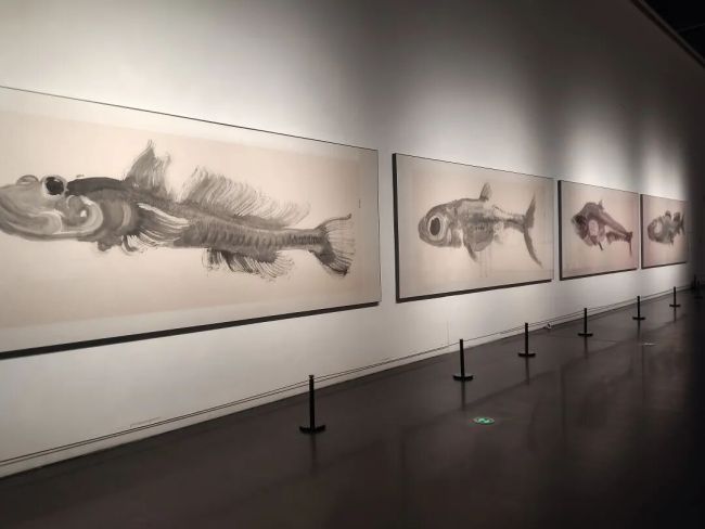 自1月18日“周京新:有鱼”特展在郑州美术馆启幕以来,36幅丈二巨幅水墨作品便以震撼人心的视觉张力与独树一帜的艺术语言,吸引了众多观众慕名而来。展览现场未设多余展板隔断,巨大的山麻纸画作直接铺陈于墙面,游鱼在黑白灰的墨色渐变中舒展身姿,既具雕塑般的立体体量感,又不失笔墨的书写性与灵动气韵,让观众仿佛置身一片澄澈通透的“鱼之秘境”。