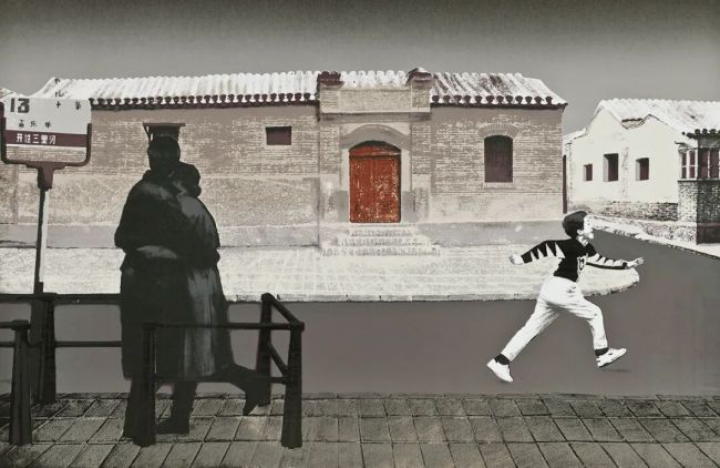 如果把时间看成一个框架,那么记忆就是被整理、定位并归纳在不同时间瞬间上的印迹复合,包含着一种复杂的观念化过程。[3]2024年,周吉荣在湖北美术馆举办的“晷时印迹——周吉荣艺术展”的开幕式上说道,“时间是贯穿我作品中的关键词,串联起我对时空、物性与文化记忆的探究”[4]。这一创作意图与他的生活背景深度契合,他成长在改革开放以来中国城市化进程飞速发展的时期。此时,周吉荣有关老胡同拆迁、高楼崛起等城市记忆的创作以时间叙事为主线,通过传统与现代城市景象的对比,呈现记忆的承续或断层。周吉荣早期的《北京之十二》和《城市——惊蛰之五》(图1)等版画作品正是这一创作特点的代表。画作中,灰色的北京胡同、四合院和围墙等元素,充满了历史的韵味与人文气息,这种对老北京视觉符号的提炼并非周吉荣的个人记忆,而是属于城市群体的共同视觉经验。胡同里散步的老人、奔跑的青年等人物形象,同样是被艺术家归纳的代际传承符号——老人代表着传统的延续,青年则象征着新生力量的涌现,周吉荣将二者并置体现了文化记忆既连接着过去又孕育着未来的特性。周吉荣善于运用版画的艺术手法将传统文脉与现代元素相融合,使作品在时间的延续中呈现出独特的魅力。例如,在《进化图典——树之一》中,古老的城墙与现代的城市景观相互映衬,体现了时间的流转与变迁,使观众能够穿越时空,感受到文化记忆在岁月长河中的延续,这种妙趣横生的时空交叠,正是周吉荣作品中迷人且深刻的地方。