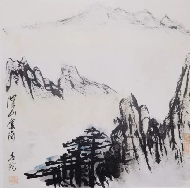 在著书立说之余,先生亦是用“偷得浮生半日闲”的功夫,写书作画,交贤诸友,以遣其兴。严格来讲,郭老的画属“文人画”一路,内容多山水,偶为花卉翎羽,尤以小品居多。其笔底之山,多为胸中之山,无论从技法风格还是师承渊源上,他从不拘泥于某家某派,而是独出胸臆,一意孤行。他用那“奔放不羁的笔触,大胆创新的构图和墨色自由的变幻”为主创思路,彻底打破了当今画坛以技为能、陈陈相因的规矩框架。他下笔果敢,构图新奇,粗笔如铁杵凿石,细笔似游丝穿云。观其笔下之山,简约而不失苍浑,大笔涂抹之间尽显巍峨恢弘之气。山川与景物之间似有云雾萦绕,或远或近,或隐或现,颇有“拨云寻古道,倚树听鸣泉”的玄机之妙。远山如黛,近水含烟,画中意境不时流露出难以言表的氤氲之美,格局大、气象新,令人回味,让人往返。