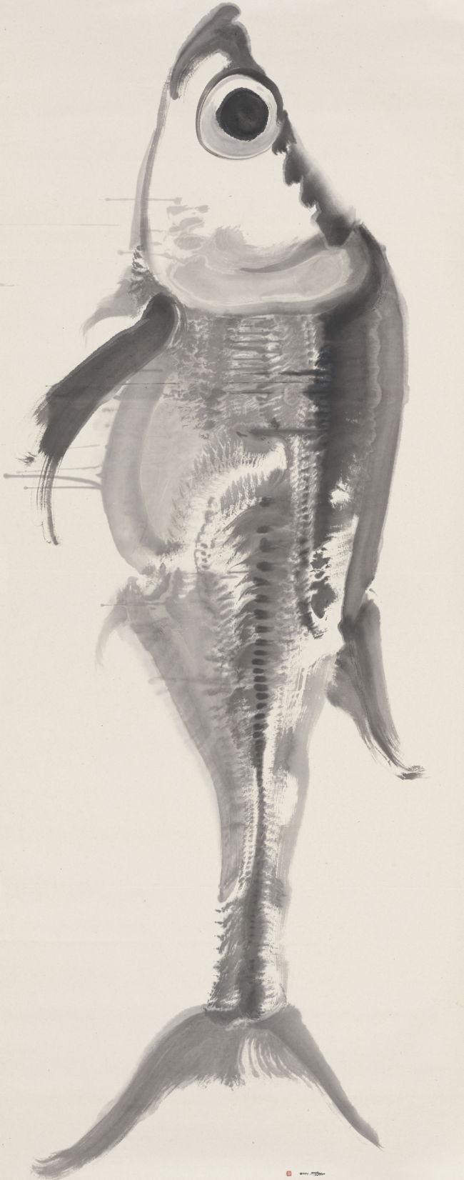 在对“鱼”这一传统意象的演绎中,周京新完成了一次精彩的当代转译。视频里的游鱼,挣脱了传统吉祥图案的装饰化束缚,不再是单纯承载寓意的符号,而是被还原为充满生命张力的个体。他以丈二宣纸为依托,将游鱼放大至极具视觉冲击力的尺度,让鱼在黑白灰的墨色律动中舒展身姿,既保留了“年年有余”的文化温情,又赋予其对生命活力、自然之道的哲思。那些隐藏在大鱼身旁的小巧游鱼,与大块面墨色形成虚实对比,在粗粝的纸张上以精准笔法构写,让画面在疏密变化中获得平衡与生机,尽显艺术巧思。