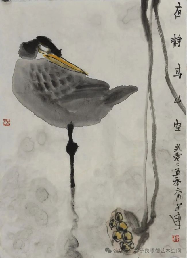 荷茎孤垂,莲蓬默立,水鸟闭目凝神。在这方留白的天地间,孤独不是寂寥,而是“静观万物皆自得”的禅意,此刻的悠闲,便是心归本真的模样。