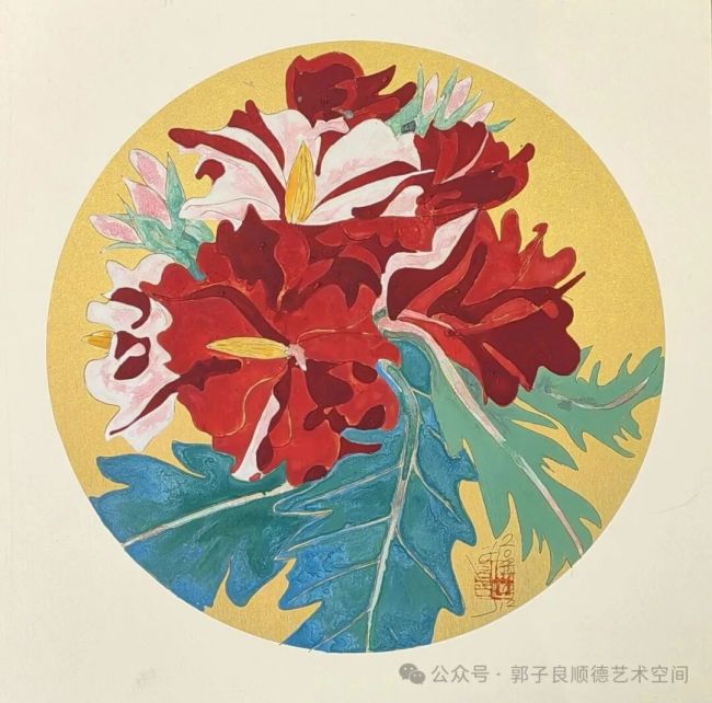 抽象的花形以跳动的姿态向上生长,色彩在对比中生出和谐。每一笔线条的起伏,都是生命力的脉搏;每一笔重彩都凝聚着对岁月的祝福,“金火相胜,吉祥如意”