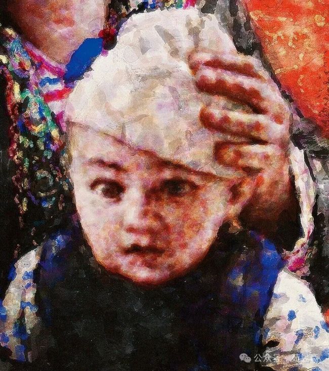 为了突出人物的内美,挖掘心灵的东西,写真素描手法是必不可少的手段,一定要使画面深入画进去,才可以体现形以外的心灵语言。这幅作品,我立足于表现伟大母亲的慈爱和仁和,来呼唤生命的可贵,因为人生命的意义不同,体现的价值也就不同。比如母亲就好像是太阳,她以温暖的光辉照耀着我们成长,以从容担当的心态撑起家庭的负重,来获取新鲜生命的坦途。这是母亲的奉献精神,这是我创作时对于主题的设想,我认为有思想的作品才可有生命的存在。我采用的构图多以西方的满构图为主。我的创作手法是参照了西方乡土写实油画,对照写实主义技巧和印象派点彩的吸收,这种手法深入了母亲欣慰的遐想和孩子天真无邪的表情及手的刻画,更突出了母亲内心的纯净、朴素的大爱以及她发自心底的祝福与渴望。黑、白、红三种色彩的对比,使得人物的内心“明亮”起来,整个画面既厚重又艳丽,在强烈的视觉冲击中,有效地突出了人物的精神面貌,让这活生生的生命“站立”在我们面前,引起我们无尽的遐想。画面中小孩的黑棉衣裤和母亲服饰上用的蓝色,让整个画面色彩更丰厚、稳重,这是我们在协调画面中要注意和善于发现的一个问题,进一步说就是色相的转折越丰富,所呈现在画面的内容也就越丰富。