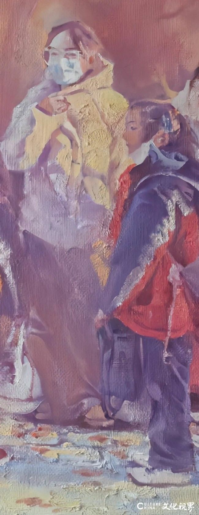 最动人的是细节的克制表达:口罩遮住了半张脸,却遮不住老师拢紧衣领的守护姿态,也藏不住孩童踮脚张望的期盼眼神。侯滨没有刻意刻画表情,而是通过肢体语言传递情绪——背对观者的孩子背着鼓囊囊的书包,红衣少年微微前倾的肩头,都在诉说着“等家长”这个日常动作里的百感交集。这种“不画表情而情绪自现”的处理,正是他写意性油画语言的精妙之处。