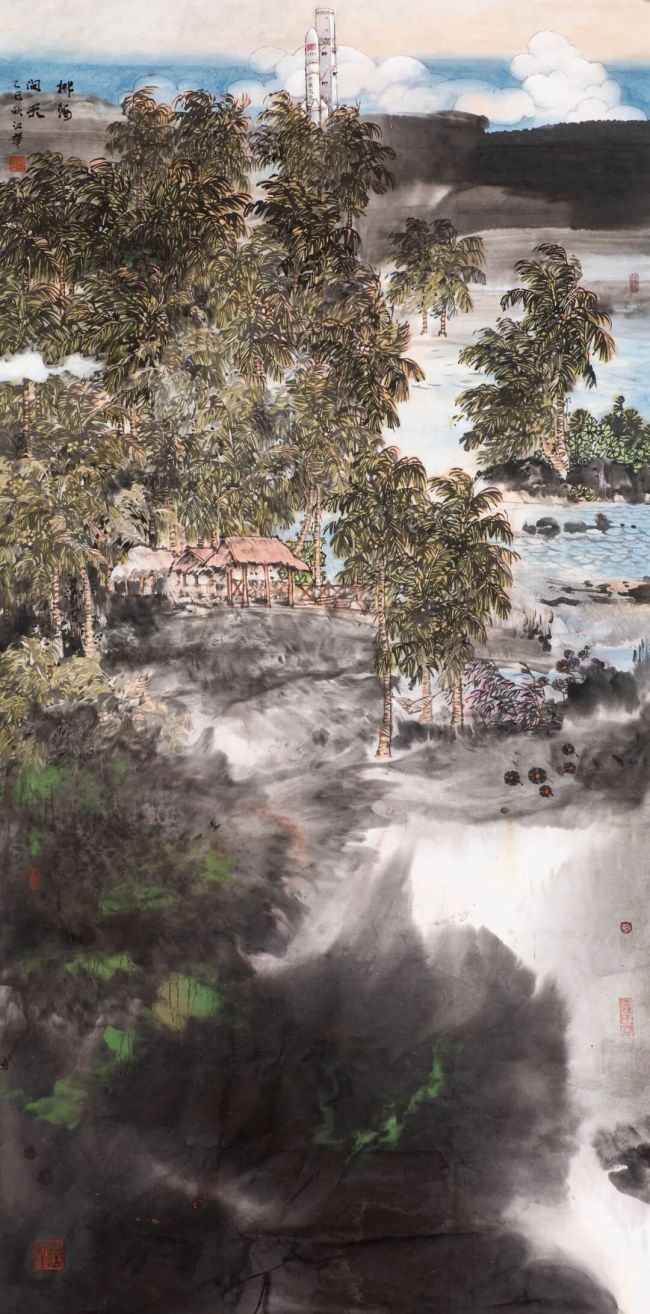 地域特色转化上,我秉持“脱略形骸,直取神韵”,借生宣墨韵跳脱符号堆砌。海南风物的核心是阳光与水汽的氤氲气韵,我以积墨法刻画山岩肌理,淡墨渲染海风律动,焦墨点苔显雨林生机;花青、紫红、藤黄与水墨调和后,借生宣晕染实现色墨交融,让热带色彩若隐若现,突破地域题材“符号化”藩篱。