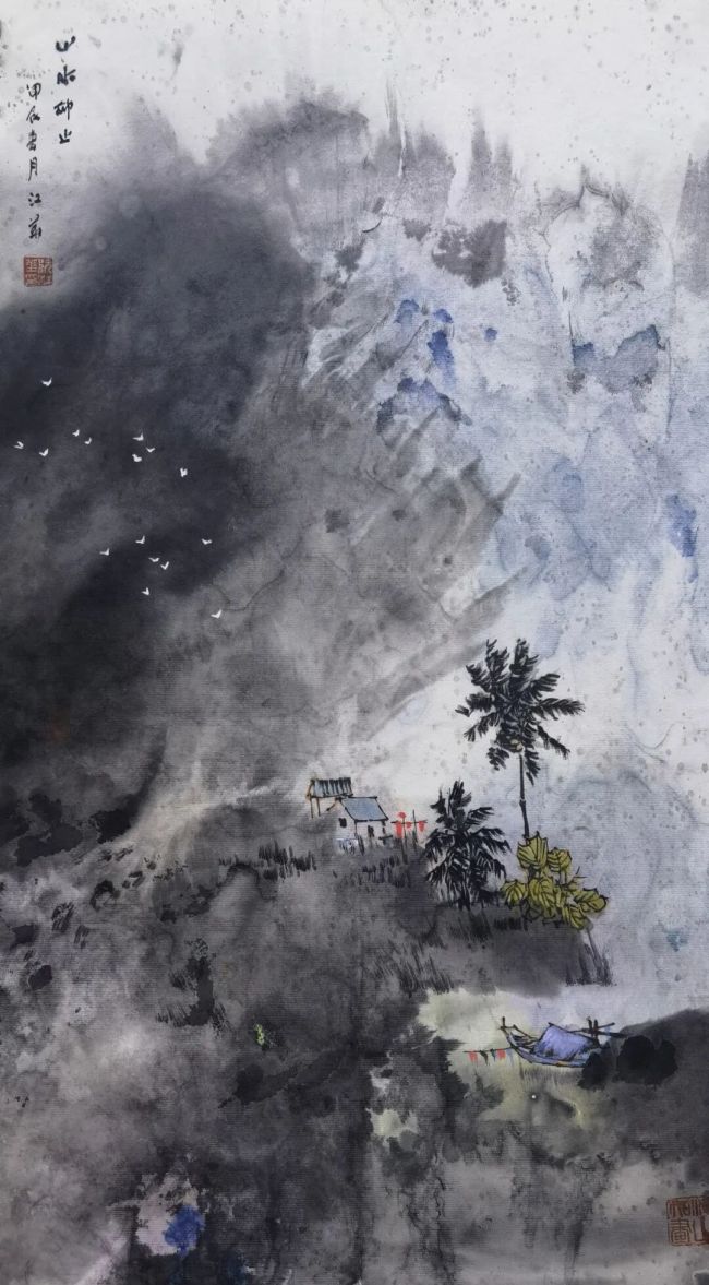 地域特色转化上,我秉持“脱略形骸,直取神韵”,借生宣墨韵跳脱符号堆砌。海南风物的核心是阳光与水汽的氤氲气韵,我以积墨法刻画山岩肌理,淡墨渲染海风律动,焦墨点苔显雨林生机;花青、紫红、藤黄与水墨调和后,借生宣晕染实现色墨交融,让热带色彩若隐若现,突破地域题材“符号化”藩篱。