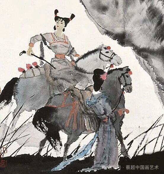 作品以几株巨大的花树为视觉中心,老干苍劲、繁花如云,淡墨与粉红交织营造出朦胧而绚烂的早春氛围。几位唐代仕女衣袂飘飘,骑马缓行于花树之下,人物线条简练而神态生动,马匹造型奔放有力,动静之间尽显春日出行的悠然意趣。