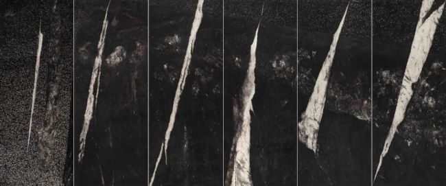 郭志刚:我在自己的墨材质语言表现手法上,首先是有画什么的思维想法,然后因画的内容来选择墨的材料,让技术的手段产生出有意味的技巧。所以一开始就想让墨的色彩有聚合体般的稠密紧致感,使画面呈现大块的墨团上有微妙如夜色般的寂静的丰富性,不像其他水墨艺术家在表达大体量黑时在面积上出现墨色运用的呆寂感。我在墨体与线体运用上的节奏变化细节的手法,是观看眼前自然物的结构变化与书法的运笔韵律一致性来展开。在画面双层拓叠的生宣纸上将炭痕、笔痕、印痕和运用手的指尖的轻与重的揉搓漫卷开来,因而在所有数个丈二尺幅的作品绘制中,时常将手指指尖的嫩皮肤磨成渗出殷红的血丝状才停歇下来,待指尖的肉体伤痛疗愈之后再接着进行新的揉搓,墨迹与痛的擦痕始终伴随画面形态的游走,就像古代的行旅者穿着单薄的鞋,终日劳顿行步在艰难充满泥石和荆棘的路途上,脚下的鞋与脚趾在与地面凹凸不平的日夜摩擦中,化为地面温暖的印痕。