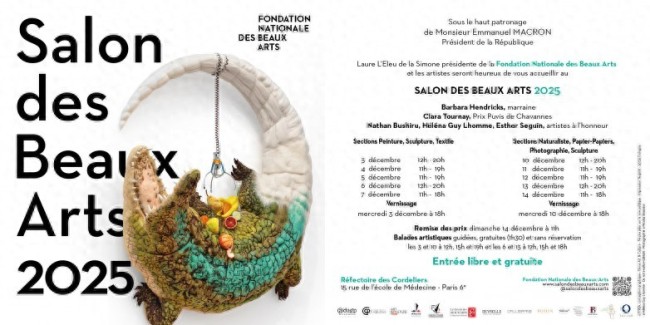 2025年12月03日,由法国文化部支持,法国国家美术基金会Fondation Nationale des Beaux Arts (原法国国家美术协会Société Nationale des Beaux Arts )主办的第161年法国巴黎国际艺术沙龙展在法国科德利埃展馆成功开幕,本届展览持续到2025年12月14日闭幕。共分两场举办,分别是12月3日-7日的绘画类、雕塑类、纺织艺术类入选作品展以及12月10日-14日的自然主义类、纸艺类入选作品展。