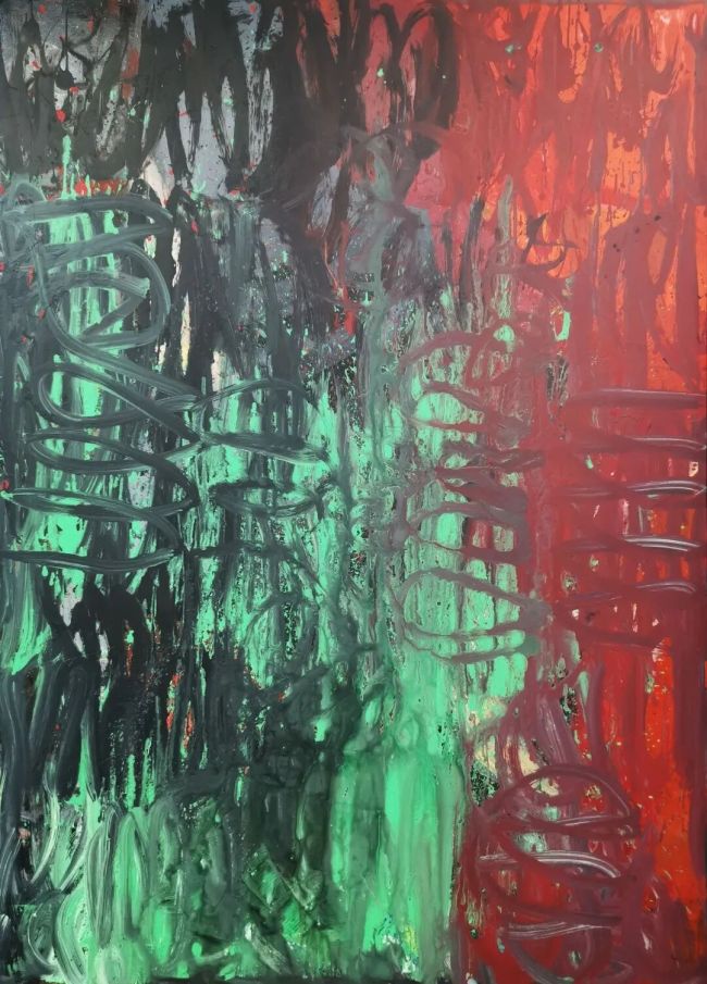 如果说他的早期创作更强调形式语言的确立,那么今天的李磊显然已经不再为“如何画”这个问题所困扰。他对材料的掌控极为熟练,泼洒、滴落、覆盖都已经成为身体反应的一部分。这种熟练并没有带来收缩,反而让画面获得了更大的展开空间。你能清晰地感受到一种持续的激情:绘画仍然被当作一种高强度的行为,而不是被审美化、被抚平的结果。