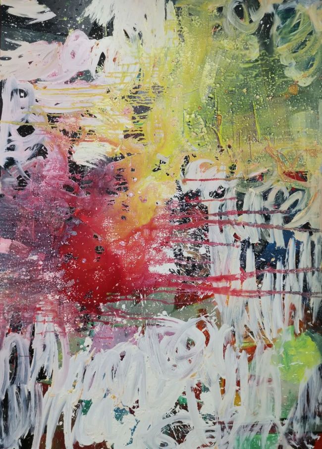 这一点,在他近年来反复出现的“倾听大海的声音”“倾听大地的声音”等命名中尤为明显。这些标题并不是为了提供具体的观看线索,而更像是一种姿态的确认:绘画所指向的,并非个人经验的细微波动,而是人与自然、生命与宇宙之间的巨大共振。画面中的流动与爆裂,并不是对自然形态的再现,而是一种精神层面的模拟——能量如何生成,如何彼此激发,又如何在画布上留下痕迹。