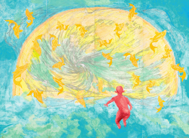 “水”系列源于艺术家独特的生命体验。方力钧对水的复杂认知,源于小学时期险些溺水的创伤经历,这使他对水形成了本能的恐惧,这种个人化的生命体验,在艺术创作中完成了向集体隐喻的升华。在作品中,他并未将水作为单纯的背景元素,而是以漂浮在水面上的光头形象为核心视觉符号——人物或仰面漂浮、或肢体舒展、或隐约挣扎,始终处于一种脱离地面支撑的“非稳定状态”。这种视觉化的呈现既表现了艺术家对水的复杂情感,更将个人的心理障碍转化为具有普遍意义的生存困境,试图使观者理解现实生活中的无奈。