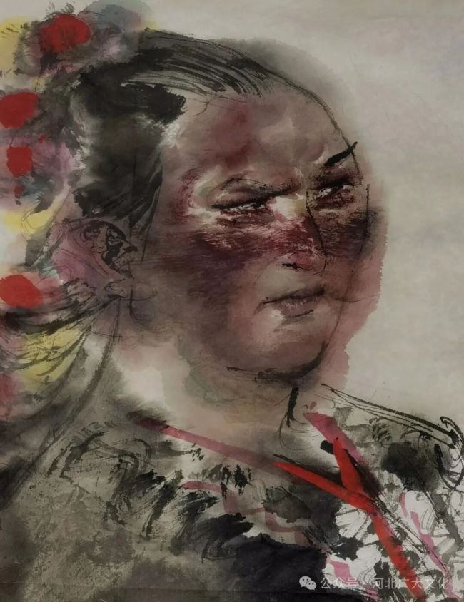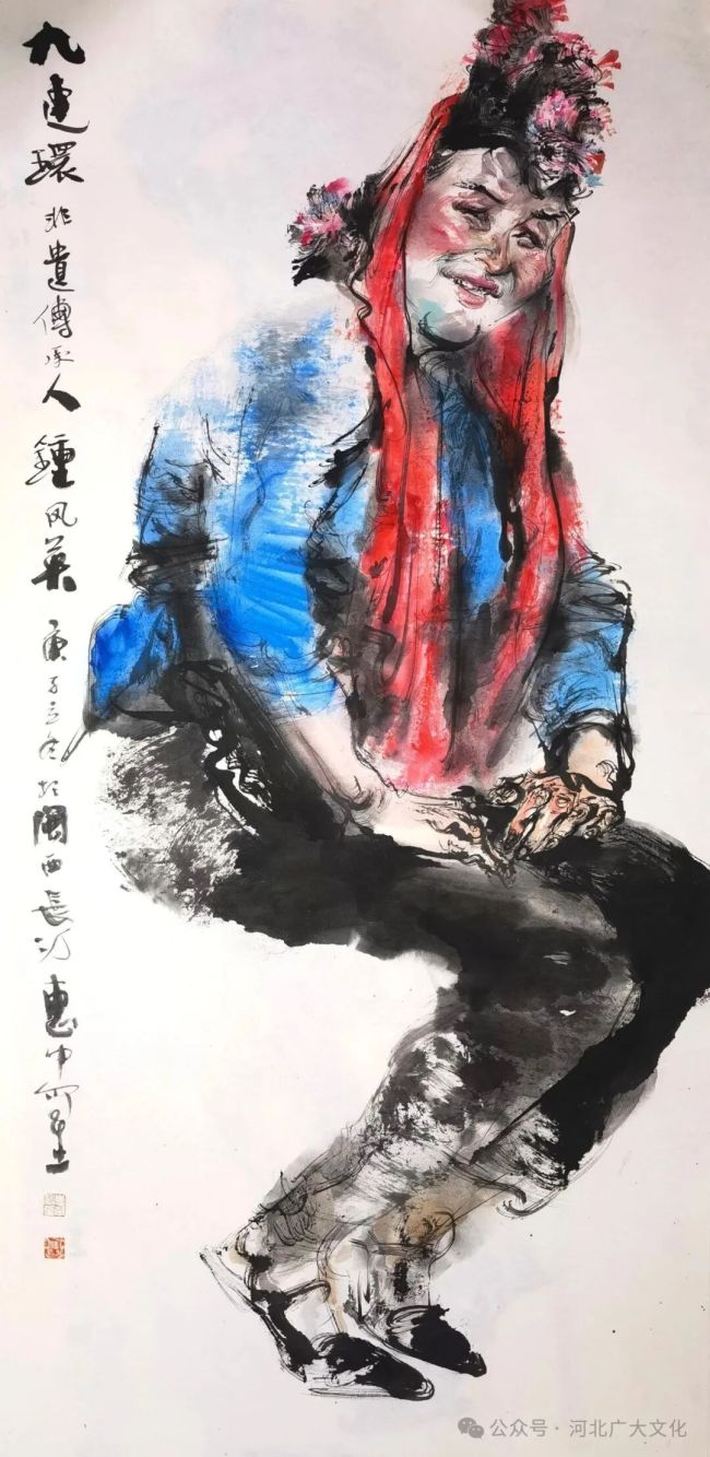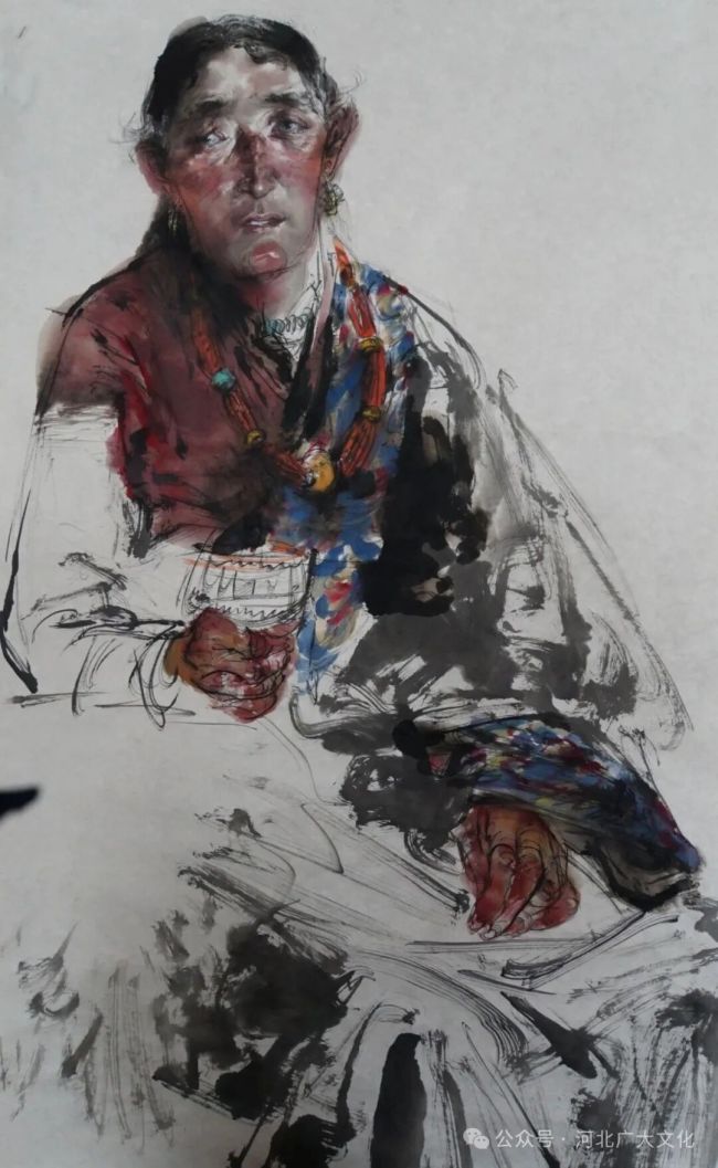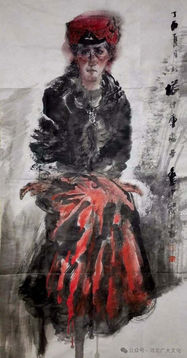 在人物造型的塑造上,任惠中始终坚守“以形写神”的核心,却又不拘泥于具象的形似。他笔下的人物,皆取自烟火人间,多是扎根于土地、身着民族服饰的平凡人物,没有矫揉造作的姿态,没有刻意美化的面容,每一个形象都带着原生的质朴与鲜活,带着生活打磨出的真实质感。他不追求面面俱到的写实刻画,而是抓住人物最具精神特质的瞬间,以概括、凝练、夸张又不失分寸的造型语言,删繁就简,去伪存真,将人物的骨骼、神态、气韵牢牢抓住。面部的刻画点到即止,眉眼口鼻的勾勒,不求纤毫毕现,但求神完气足,一抹红晕、一道墨线,便将人物的喜怒哀乐、沧桑阅历、淳朴心性尽数道出;身形与服饰的描绘,更是大胆写意,将民族服饰的繁复纹样、层叠衣料,转化为笔墨的节奏与韵律,纹样不再是精细的描摹,而是化作线条的穿插、墨色的块面,衣纹的走势随身体的动态自然舒展,笔墨随形体的转折起伏跌宕,让服饰成为人物气质的延伸,让造型成为精神的载体。