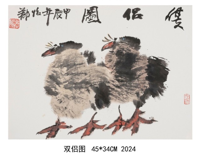 传统花鸟画多以比德为核心,如梅兰竹菊喻君子品格。姜怡翔则将题材转向生活镜像,以游鸭、芦花鸡等日常物象传递闲适、诙谐、共生的生活态度。如《小淘气》、《伴》等作品,以动物的憨态与互动,映照当代人对温暖与陪伴的追求,让传统花鸟画从书斋雅趣走向大众生活美学。