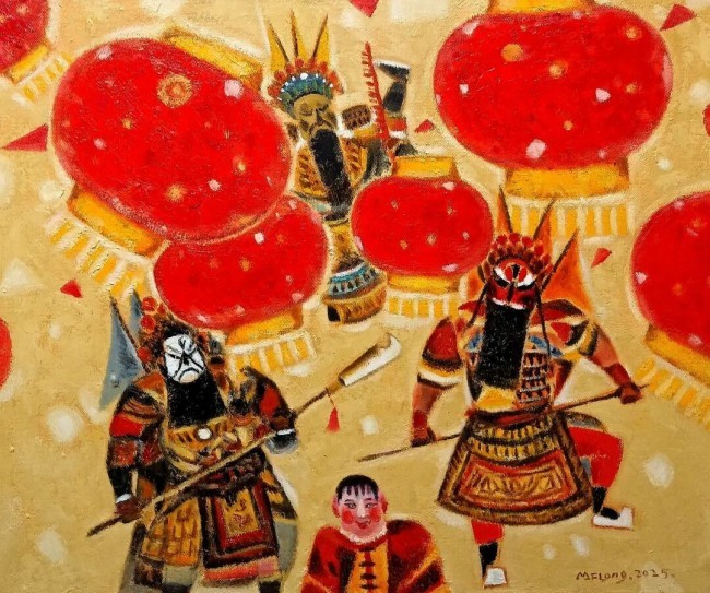 更为精妙的是,他将西北民间艺术中诸多非绘画性的形式智慧,不着痕迹地“转译”为自己的油画语言。岩画中那种古朴、粗犷、直指物象神韵的线条意趣,在他的笔触中得以复活,行笔往往果断而肯定,带有一种雕刻般的力度,勾勒出物象概括而坚实的轮廓,摒弃了多余的柔媚与琐碎。剪纸艺术中特有的平面化意识、凝练夸张的造型手法以及虚实相生的空间观念,则被他巧妙地融入画面的构成之中。物象的分布与叠压,常呈现出一种经过提炼的秩序感,在二维平面上经营出富有节奏与张力的结构,画面元素既相互依存,又保有某种独立的审美价值,如同精巧的民间剪影在画布上的交响。这种对民间艺术精髓的吸纳,绝非表面形式的嫁接,而是深入其骨髓,领悟其如何以最质朴的方式表达最真挚的情感和最本质的认知,进而将其化合为一种当代的、个人的绘画语法。