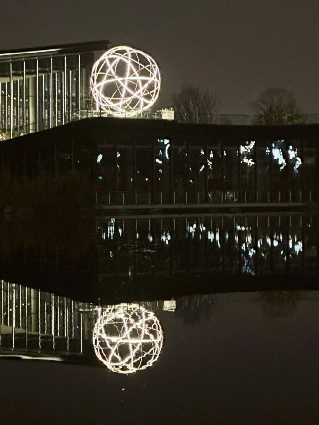 其一,空间层面的深度嵌入。策展团队摒弃简单的作品陈列,依据公园地理人文特征进行定制化布局:贝纳·维内(Bernar Venet)4.1米高的钢构作品《无序的弧》矗立于三环路主入口,成为理性与诗意交织的城市门户;隋建国《合古塔》立于中央水舞台,以“以虚写实”理念完成工业质感向人文思考的过渡;黄蔚欣借用最新材料创作的《月茧》,与郑路的不锈钢雕塑《淋漓》分置湖畔。夜间,作品通过编程灯光、湖水映射,成为连接两岸的视觉焦点,从而实现了艺术与空间的共生共融。这种布局让观众在游园中与艺术不期而遇,使“观展”本身成为公园景观的有机组成部分。 (图7、图8)