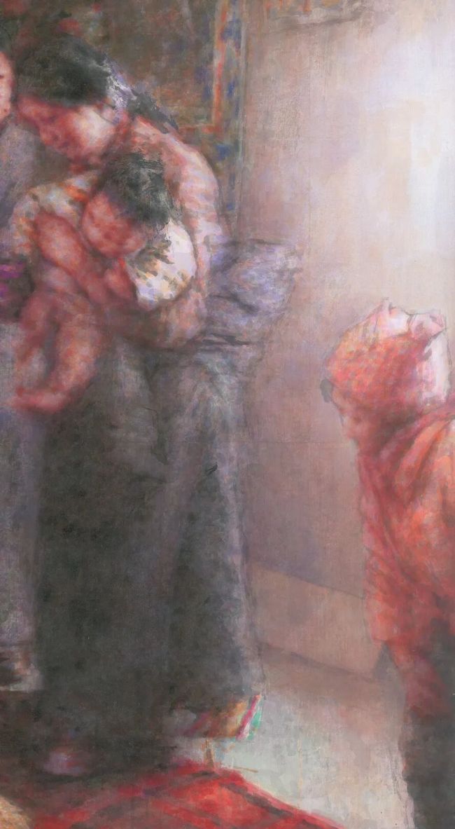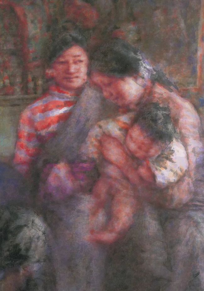 《福地祥光》是我在2009年为美展而创作的一幅作品。这幅作品一反我平常的绘画形象,让人物以虚幻的景象出现在画面中,脱离于写真的塑造而以模糊迷离的物象来反映绘画的主题精神。老子说:“惚兮恍兮,其中有物;恍兮惚兮,其中有精。”这是他对绘画物象的一种阐释,也是他的意和神的一种理解。这种手法是我对新作品的一种尝试,改变一种习惯的创作方法而探索水墨重彩的新奥妙。我经常通过各种途径来寻找灵感,并加以多元素手段的实践和融合,希望能用任何方式都能完美地创作一幅作品。