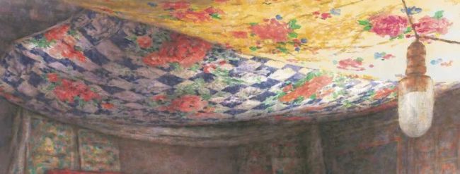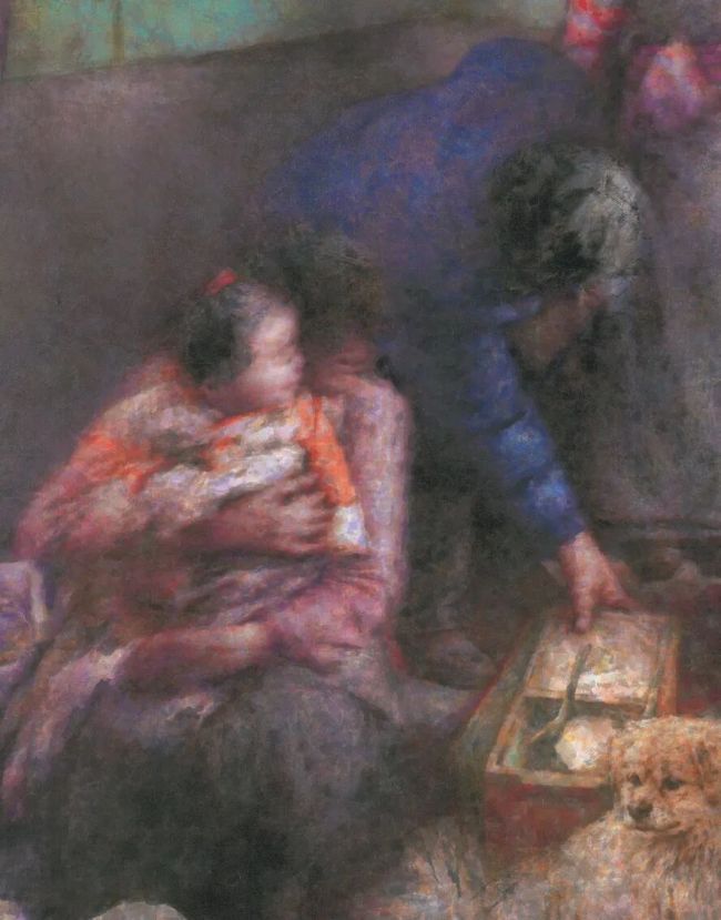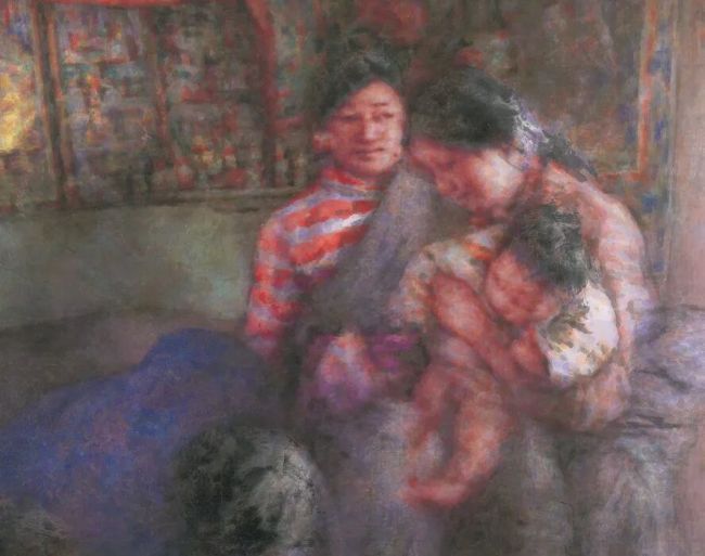 这幅作品是在照相机低像素的情况下拍摄的相片中找到的灵感,以真人、真物、真景的方式来展示画面,近景的火炉、小狗和房子的顶棚、电灯是写实的,人物和其他环境是虚化的。近景和房顶的写真加强了人物及背景的虚幻程度,让整个画面气氛笼罩在似云似梦的迷蒙之中。西藏的冬天是寒冷的,海拔一般都在4500米左右,而在作品中的屋里却体现的是暖洋洋的感觉。一位妇女怀抱着孩子坐在火炉旁,老人在挪动盛煤的小箱子,这时刚进门的小女孩,没去看另外一位妇女在为孩子换衣裤而是在看老人如何搬弄小箱子,最后站在墙角的少女在给孩子拿着裤子。墙上供奉着班禅们的佛像、地下铺着厚厚的地毯、房子的顶棚是两块被单相拼而成的,虽然简陋,但却掩饰不了藏族同胞朴素、纯厚的性格,她们在以炙热的情怀享受着雪域高原赐予他们的幸福。画中这种家庭和谐生活的场景让人产生对甜蜜生活的向往,对美好生活的追求。