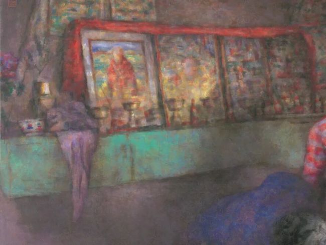 我刻画过许多西藏的高僧大德形象、或静坐袖手、或和蔼微笑,而这幅作品中虚化的背景佛家也不再是藏族同胞的虔诚膜拜,而展现的是佛在心中的化境。我在画面中表现的新颖手法,实际是我对藏族同胞魂牵梦绕的一种眷恋,是他们给予我艺术生命的一种感恩。我将用画笔不停地去塑造我敬爱的西藏——我心中的神。