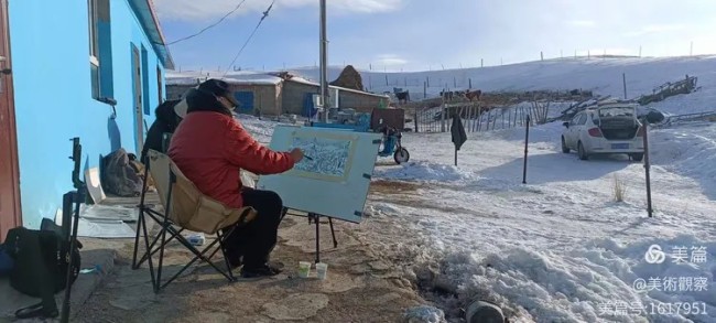在极寒的冬季新疆,我体验了一把不同寻常的写生历程。乌鲁木齐的冬天,准确地说是南山团结村的冬天,手机天气预报显示是零下十二度。此刻是早晨九点二十六分,外面却是一片漆黑。那天陪同我们的乌鲁木齐画家提议,大冬天里,内地几乎没有什么人过来写生,每天写生的最好时间段是下午一点到四点,其他时间段冷得手都拿不出来。于是下午一点,我和乌鲁木齐的张老师,以及许剑老师小两口,趁着其他老师午休的时间,去了一处哈萨克牧民家里,在他的院子里选了一个地方开始写生。周边全被茫茫无际的大雪覆盖着,只有我眼前写生的院子里裸露着的牛、拖拉机和房子,构成了一幅极美的画面。说到这里,还得感谢从乌鲁木齐赶过来给我送写生工具的年轻雕塑家许剑。上次在昌吉,我们结下了很深厚的友情。许剑小伙子很优秀、很勤奋,涉猎广泛,国、油、版、雕全都涉猎,而且都做得相当不错,最突出的是他的雕塑。他应该是目前乌鲁木齐最年轻、最优秀的雕塑家,乌鲁木齐市区多处都有他的大型雕塑作品。